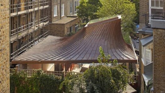 Здание возведено посреди типичной городской застройки Лондона и окружено ландшафтным садом.