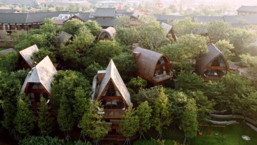 Над проектом этого комплекса трудились специалисты студии AOE. Номера отеля представляют собой компактные домики площадью от 27 до 45 кв. м, которые находятся на высоте примерно 5 метров, т.е. на уровне крон деревьев. Гостиница расположена возле леса и реки, поэтому подобное решение китайских архитекторов позволяет ее постояльцам более полно ощутить единение с местной природой.
