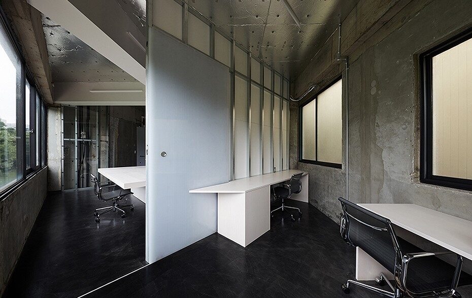 С помощью балок на потолке и колонн японская студия создала в этом помещении четыре открытые рабочие зоны. В центре офиса расположен квадратный стол, имеющий ширину по три метра с каждой из сторон, что позволило обеспечить достаточное расстояние между сидящими сотрудниками компаний и сформировать общее для всех пространство. Из широких окон офисного помещения открывается прекрасный вид на живописный сад.