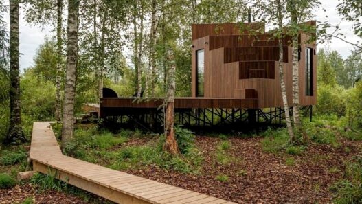 Площадь этого уединенного компактного бунгало, возведенного посреди нетронутой дикой природы, составляет 28 кв. м. В небольшой гостинице можно полноценно отдохнуть, наблюдая за местными животными и сохранившимся болотным ландшафтом. Внутри здания предусмотрена ванная комната, также тут имеется печь и кровать. Специальная обзорная площадка находится на крыше объекта.