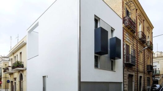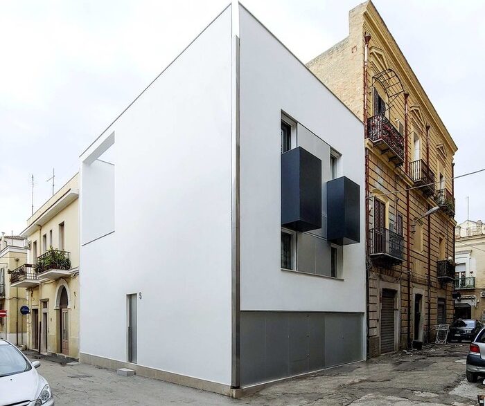 Возведенный по проекту Raimondo Guidacci дом с двумя балконами имеет площадь 80 кв.м. В нем предусмотрено четыре уровня. Подвал фактически является гаражом, на первом уровне находятся кухня и гостиная, на втором имеются три комнаты, а третий этаж связан с террасой. Кроме этого, новое здание получило компактный внутренний двор.