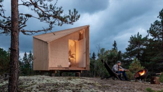 Домик площадью менее 10 кв. м. имеет деревянные стены и асимметричную двускатную крышу. Такое модульное сооружение доставляется в любую точку страны и затем оперативно собирается там из деталей заводского изготовления. Дополнить подобную конструкцию можно туалетом и кухней, расположенной на открытом воздухе. Предусмотрены различные варианты отделки фасадов здания, включая гальванизированную сталь.