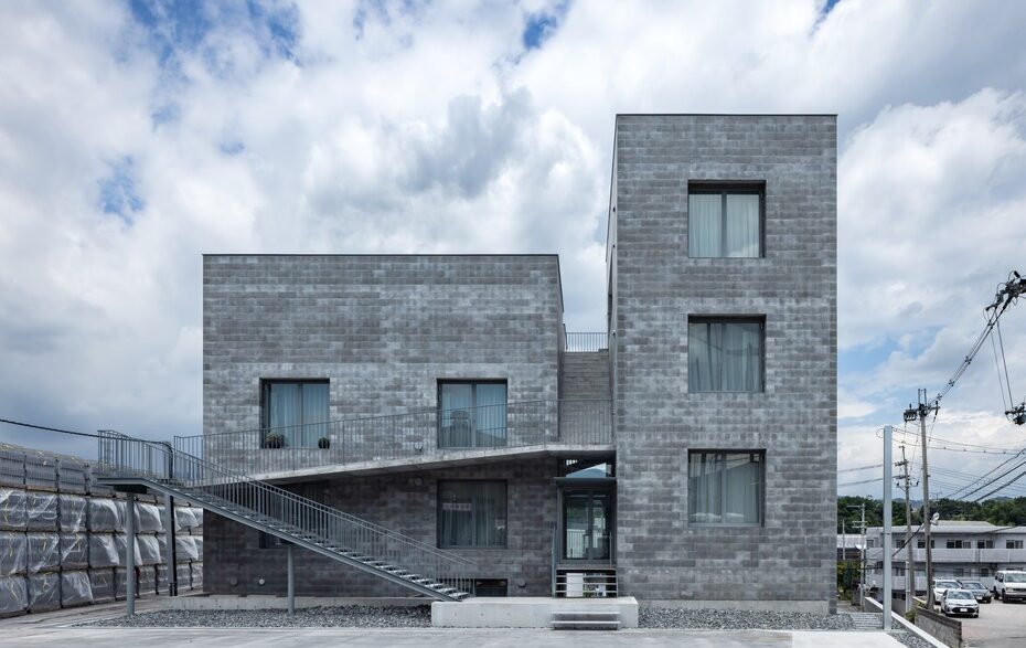 Спроектировали этот объект коммерческой недвижимости специалисты компании BORA ARCHITECTS из Осаки. Здание предназначено для одного из японских производителей бетонных блоков. Конструкция такого сооружения с двойными стенами позволила добиться высокой его функциональности и энергоэффективности. Зазоры между стенами служат здесь изоляционными слоями, улучшающими тепловые характеристики и позволяющими снизить расходы на отопление и охлаждение комплекса. Подобные пустоты также обеспечивают хорошую гидроизоляцию, отводя влагу наружу. Таким образом, при строительстве здания не потребовалась дополнительная изоляция и облицовка. Необработанные поверхности бетонных блоков остались здесь открытыми как внутри, так и снаружи.