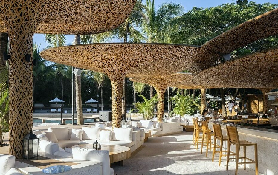 Обновленный пляжный клуб находится среди пышной зелени в комплексе The Sanya Edition, который расположен в заливе Хайтан (КНР). Разработанную для такого пространства концепцию дизайна решили назвать «Под деревом». Здесь установили несколько древовидных навесов, имеющих разную высоту и форму. Для изготовления этих конструкций использовалась местная техника плетения из бамбука. Подобные навесы отличаются не только оригинальной текстурой, но и экологичностью. Кроме этого, возведенные постройки хорошо гармонируют с охраняемыми деревьями, имеющимися на территории комплекса.