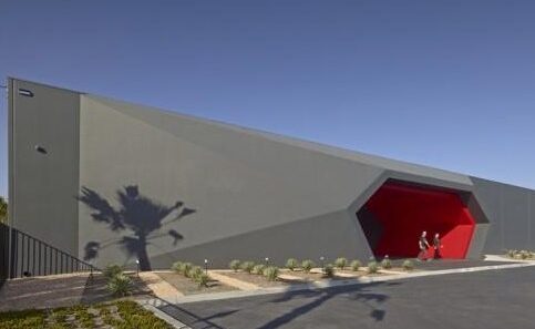 Внутри довольно просторного здания построен ярко-красный коридор, внешне
