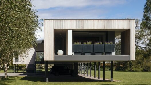 Спроектировала это одноэтажное здание площадью 300 кв. м. компания John Pardey Architects. Дом с большими панорамными окнами расположен на берегу реки Лоддон и исключать вероятность наводнения здесь нельзя. Поэтому решено было установить жилое строение на стальных сваях, поднимающих его на высоту 2,2 метра.