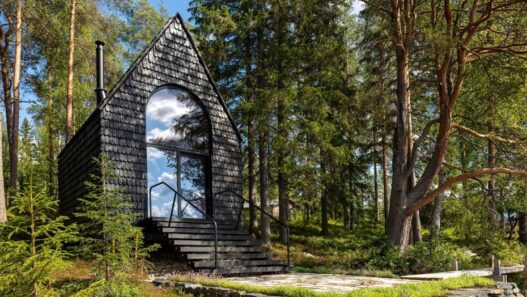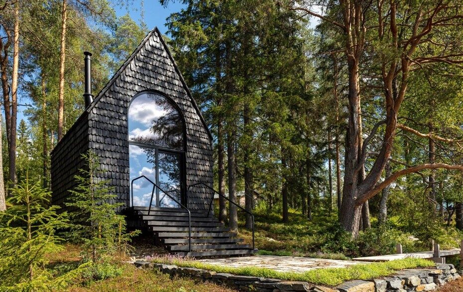 Площадь спроектированного Pirenen Salo Oy здания составляет 24 кв.м. Сооружение получило остроконечную крышу, а его черные фасады отделали дранкой. В доме имеется раздвижная стеклянная дверь и арочное окно прямо над ней. Следует отметить, что внешний облик такого оригинального жилища не соответствует традициям скандинавской архитектуры.