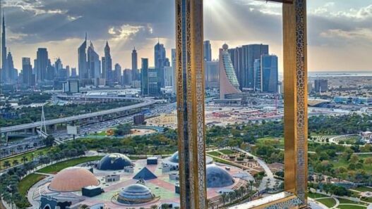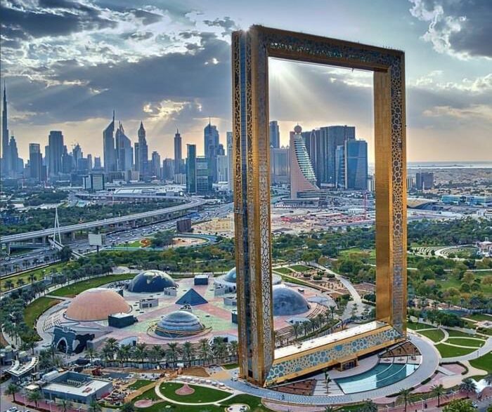 У подножия необычного комплекса, построенного в Дубае, расположен фонтан и музей.