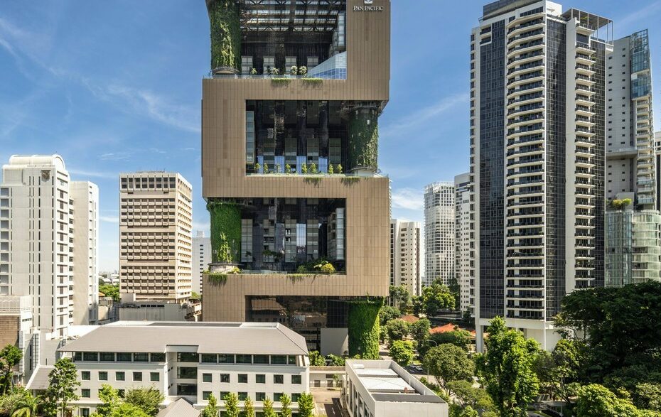 Гостиница Pan Pacific Orchard получила несколько больших зеленых террас, «врезанных» в прямоугольник небоскреба и обеспечивающих пассивное охлаждение, что очень важно в экваториальном климате данного мегаполиса. Огромные объемы выполняют тут функцию солнцезащитных навесов для всех пространств и комнат, а потолки действуют как «тепло-вые зеркала». Все террасы имеют свою собственную тематику (сад, пляж, облака) и окружены гостиничными номерами в крупных шестиэтажных блоках. Колонны, покрытые живыми растениями, визуально объединяют этажи оригинального здания.