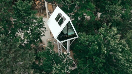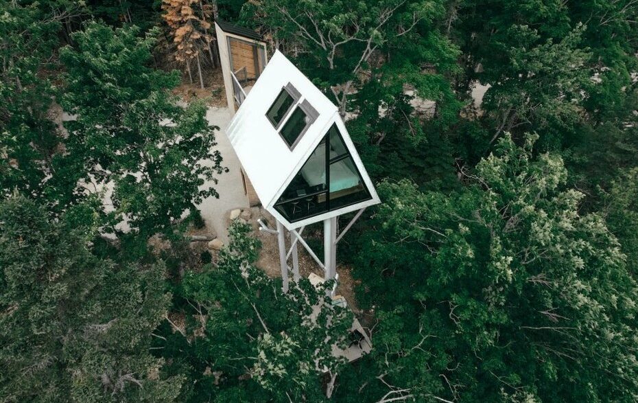 Проект, получивший название Uhu, был реализован в провинции Квебек (Канада). Оригинальный современный дом, предназначенный для отдыха на природе, установлен на сваях на высоте 12 метров над уровнем земли. Попасть внутрь можно пройдя по винтовой лестнице и специальному мосту. В таком необычном коттедже имеется пол с подогревом, кухня, душ и большая кровать. В скатной крыше здания предусмотрено несколько небольших окошек.