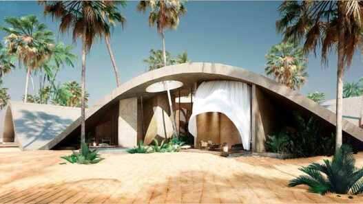 Проект этого сооружения, площадь которого превысит 19 866 кв.м., разработали специалисты студии Jasper Architects. Отель будет представлять собой искусственный оазис, гармонично интегрированный в дюны. Здесь предусмотрены не только апартаменты с иллюминаторами в крыше, но и бассейны. Волнообразный экстерьер и особый дизайн фасадов такого комплекса позволит ему выглядеть «замаскированным» в песках пустыни.