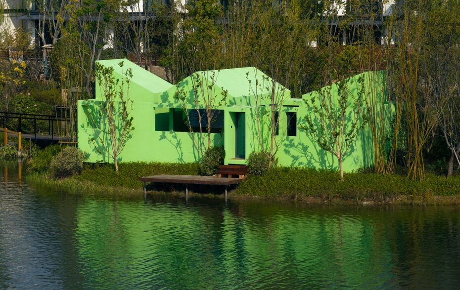 Резиденцию Oasis Cabin с яркими зелеными фасадами построили на крошечном островке в Китае.