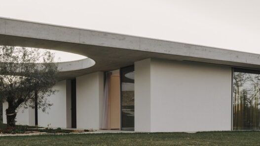 Спроектировала этот дом площадью 420 кв. м. студия Bruno Dias Arquitectura. Одноэтажное здание возвели из бетона в португальской деревне Казаль-де-Сан-Браш. Сооружение имеет нестандартные изогнутые геометрические формы, внутренний дворик и большое круглое отверстие в крыше. Архитекторам удалось обеспечить защиту внутренних помещений от близлежащей дороги, оставив открытыми для жильцов особняка красивые пейзажные виды.