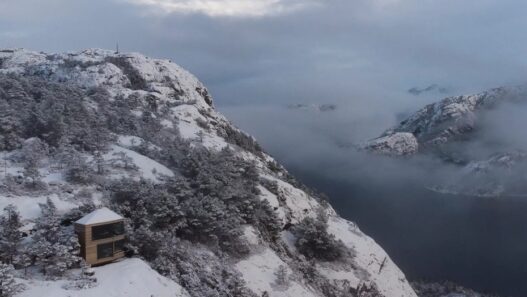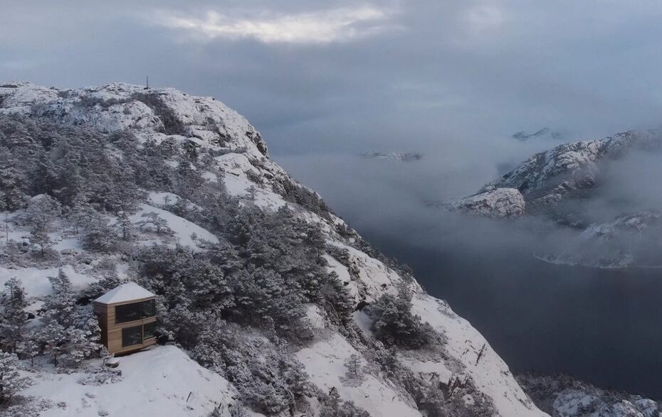 Проект The Bolder Cabins был реализован студией Snøhetta. Оригинальные домики с прозрачными фасадами возвели для нового курорта на западе Норвегии. Коттеджи, расположенные на краю горных склонов, приподняли над землей на бетонных опорах, чтобы создать у гостей ощущение невесомости. Здания построили из кедра, который со временем меняет свой цвет на серый, позволяя современным сооружениям практически полностью слиться с местным скалистым ландшафтом.