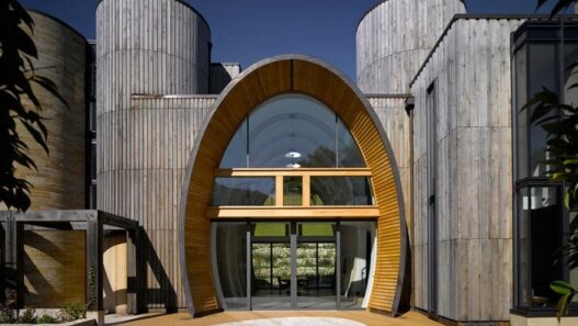 Жилой особняк с цилиндрическими башнями, состоящий из двух крыльев, находится посреди живописного ландшафта. По центру здания расположен необычный холл, внешний вид которого напоминает винную бочку. Здесь имеется главная лестница и столовая. В одном из крыльев сооружения проживают члены семьи, а второе отведено для гостей. На крыше дома разбит сад, откуда можно любоваться прекрасными видами на окружающую природу.