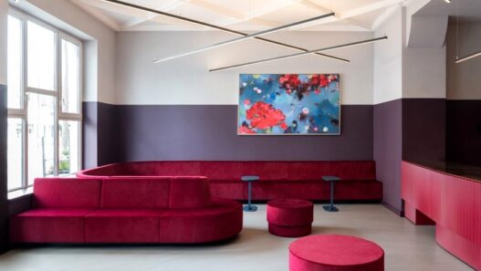 Новая входная зона данного объекта является гостеприимным пространством с длинной изогнутой лавкой и буфетом. Бархатные сиденья, стойка и закусочная здесь насыщенного красного цвета, который дополняет баклажанный оттенок, нанесенный на нижнюю часть стен. При этом их верхняя часть окрашена в бледно-серый цвет.