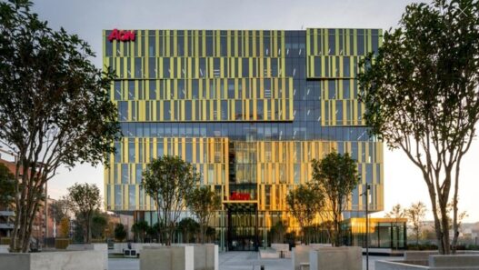 Фасады комплекса отделаны двумя материалами – панелями золотого цвета и стеклом, образующими особый контрастный дизайн экстерьера. Следует также отметить, что новый деловой объект оснастили системой сбора дождевой воды. На крышах зданий высажены живые растения. Композитные панели, использованные при отделке внешних стен, соответствуют действующим требованиям энергоэффективности.