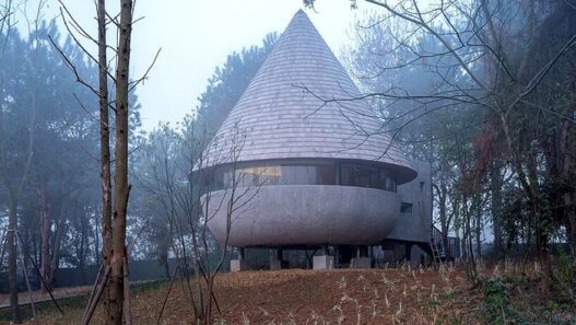 Проект этого деревянного здания, внешне напоминающего огромный гриб, разработали специалисты студии ZJJZ Atelier из КНР. Жилая площадь необычной постройки составляет 50 кв. м. Дом установлен на сваях, а его фасады отделаны бетоном. Коническая крыша объекта покрыта сосновой черепицей.