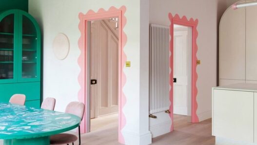В больших белых шкафах «спрятался» компактный компьютерный стол. Вокруг дверных коробок дизайнеры нарисовали розовые морские гребешки. В целом, интерьер лондонской квартиры оформлен в пастельных тонах и украшен целым рядом причудливых декоративных деталей.