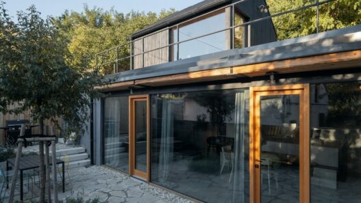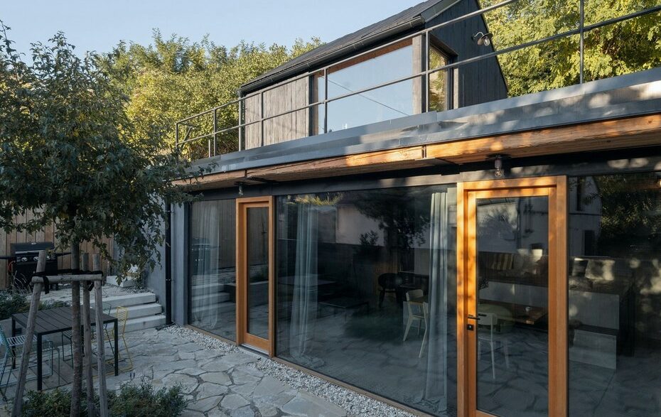 Основное старое здание расположено на земельном участке, куда сложно доставить строительную технику. Поэтому архитекторы приняли решение возвести два легких сооружения, которые заметно расширили площадь кирпичного коттеджа. Так, в новом стеклянном коробе со стальным каркасом здесь находится гостиная, а на крыше — дополнительный деревянный «домик» с сауной и небольшим бассейном на террасе.