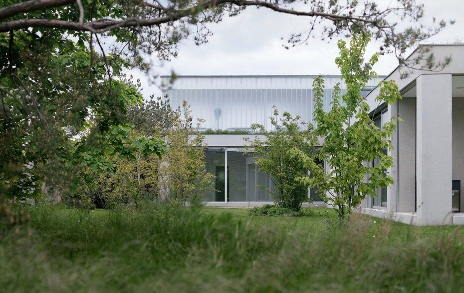 Это одноэтажное здание площадью 870 кв.м, предназначенное для молодой семьи, возвели по проекту бюро Nacházel Architekti в пригороде Праги. Земельный участок имеет наклон, что позволило архитекторам сделать основную часть бетонного дома практически невидимой для посторонних. Сооружение разделили на четыре отдельных крыла, соединяющихся в центральном главном зале и выполняющих различные функции.