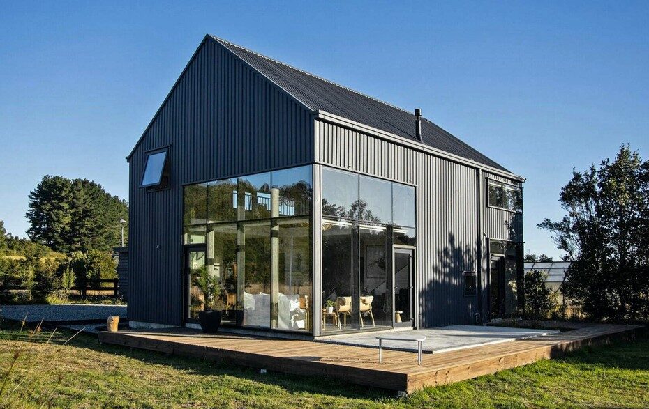 Площадь оригинального сооружения с двускатной кровлей достигает 155 кв.м. Здесь был использован плитный фундамент, однако сама коробка строилась по деревянной каркасной технологии. Наружные стены архитекторы решили обшить металлом.