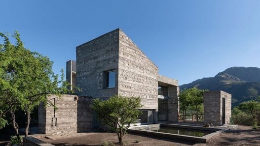 Спроектировало этот необычный дом, площадь которого составляет 290 кв. м., архитектурное бюро Nanzer + Vitas. Основными строительными материалами при возведении особняка с бассейном стали камень и бетон. Несколько объемов жилого здания получили одинаковые размеры у основания, но переменную высоту и крыши с разным углом наклона. Между ними образовались внутренние дворики.