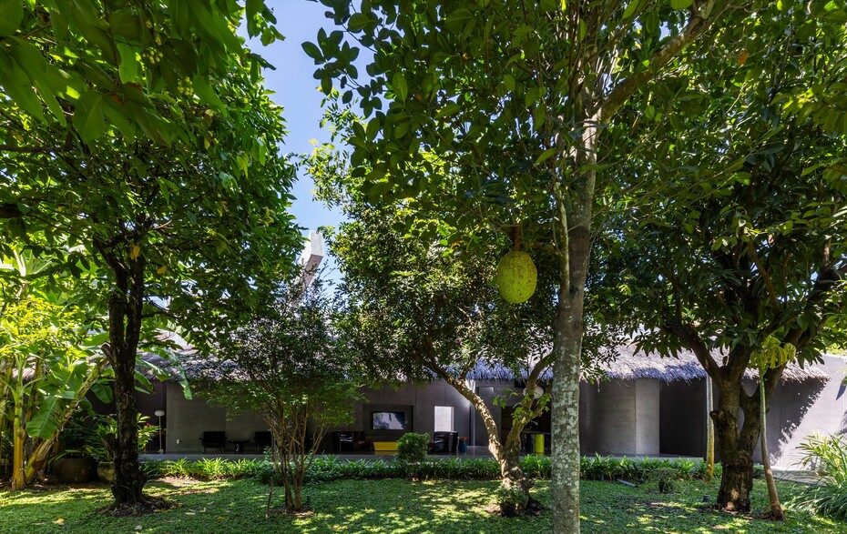 Спроектировала данную резиденцию общей площадью 877 кв. м. местная студия Kientruc O. Чтобы обеспечить жильцам тесную связь с окружающей природой, здание получило просторную открытую гостиную и столовую с видом на сад с тропическими фруктовыми деревьями и мощеный бетоном внутренний дворик. Все комнаты здесь расположены по краям строения, а увенчан дом большой открытой соломенной крышей. Бетонная балка, пересекающая внутренний двор, необходима для поддержки конструкции такой нестандартной кровли.