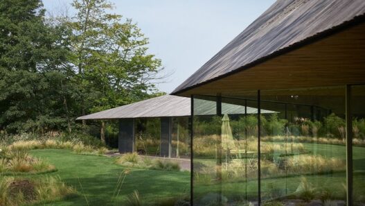 Компания TANK Architectes спроектировала двухэтажный жилой дом, получивший большую площадь остекления и скульптурную крышу.