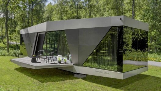 Внутри необычного мобильного здания с откидными террасами находится гостиная, кухня, спальня, ванная комната и технические помещения. Также тут предусмотрен климат-контроль и система безопасности. Технической «начинкой» оригинального сооружения можно управлять с помощью смартфона.