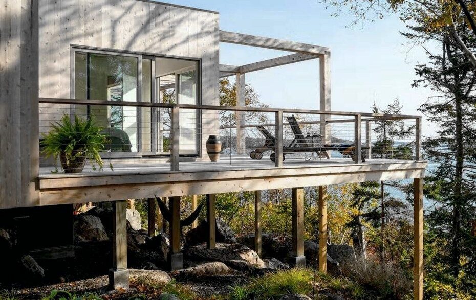 Проект под названием Woods + Water был разработан специалистами Juniper Design + Build. Жилой дом площадью 70 кв. м., возведенный в США, состоит из двух блоков, объединенных общей крышей. Также здесь предусмотрен огромный террасный настил (90 кв. м.). Для строительства здания и отделки интерьеров использовались материалы, которые отличаются низким содержанием углерода (кедр, дуб и т.п.). Утеплили сооружение, получившее большие панорамные окна, эковатой. Кроме этого, тут имеется плинтусное отопление и компактная буржуйка.