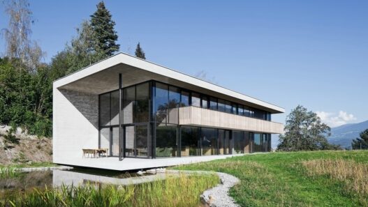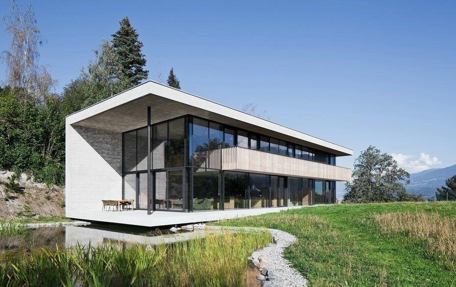 Этот проект, реализованный бюро LORENZATELIERS, получил название House ST. Площадь возведенной резиденции, имеющей вытянутую форму, достигает 670 кв. м. Здание построили из экологичного и долговечного бетона, дерева и стальных конструкций. Также объект отличается большой площадью остекления жилых зон, чтобы обитатели дома могли наслаждаться прекрасными видами на ближайшие горы. Прозрачные фасады позволили решить и проблему естественного освещения комнат. Рядом с домом находится живописный пруд.