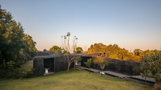 В главном здании находится кухня, гостиная, две спальни и гараж, а в возведенной новой пристройке разместили спальню владельцев недвижимости, гардеробную, ванную и рабочий кабинет. Оба сооружения соединил небольшой переход. От палящих солнечных лучей их помещения защищают оригинальные вертикальные жалюзи на окнах, изготовленные из дерева.
