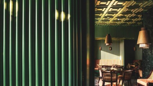 Оформлением внутренних пространств этого заведения площадью 139 кв. м занимались специалисты студии Renesa Architecture Design Interiors. Чтобы сформировать здесь уютную атмосферу они выбрали привлекательную цветовую палитру и местные натуральные материалы (зеленый мрамор и т.д.). У гостей ресторана должно оставаться впечатление трапезы на открытом воздухе.
