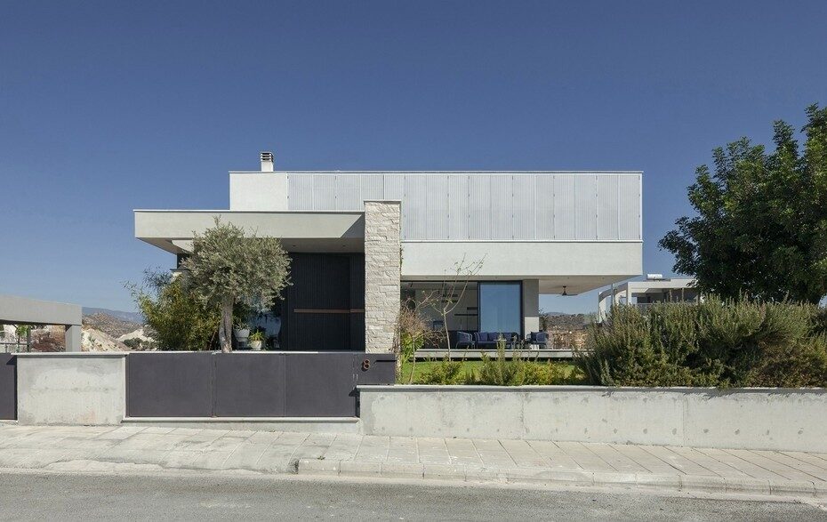 Нижний уровень с мощными стенами и находящимся тут гаражом и подсобными помещениями частично оказался утопленным в холм. С северной и западной сторон дом получил закрытые фасады. Между тем южная и восточная его стороны имеют панорамное остекление: здесь расположена социальная зона с гостиной, столовой и кухней. Предполагалось, что жильцы резиденции будут проводить много времени на свежем воздухе, что соответствует традиционному кипрскому образу жизни.
