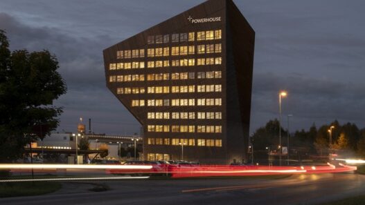 Называется данный объект Powerhouse Telemark. Спроектировала и построила его студия Snøhetta при участии специалистов R8 Property, Skanska и Asplan Viak. На крыше и фасаде одиннадцатиэтажного строения установлены фотоэлементы, способные вырабатывать каждый год 256 000 кВт/ч. Геотермальные колодцы позволяют его отопительной системе эффективно охлаждать и обогревать помещения. Особая конструкция сооружения дает возможность накапливать тепло в дневное время и затем «отдавать» его вечером. Предполагается, что подобная новостройка сможет производить энергии больше, чем ей необходимо для собственных нужд.