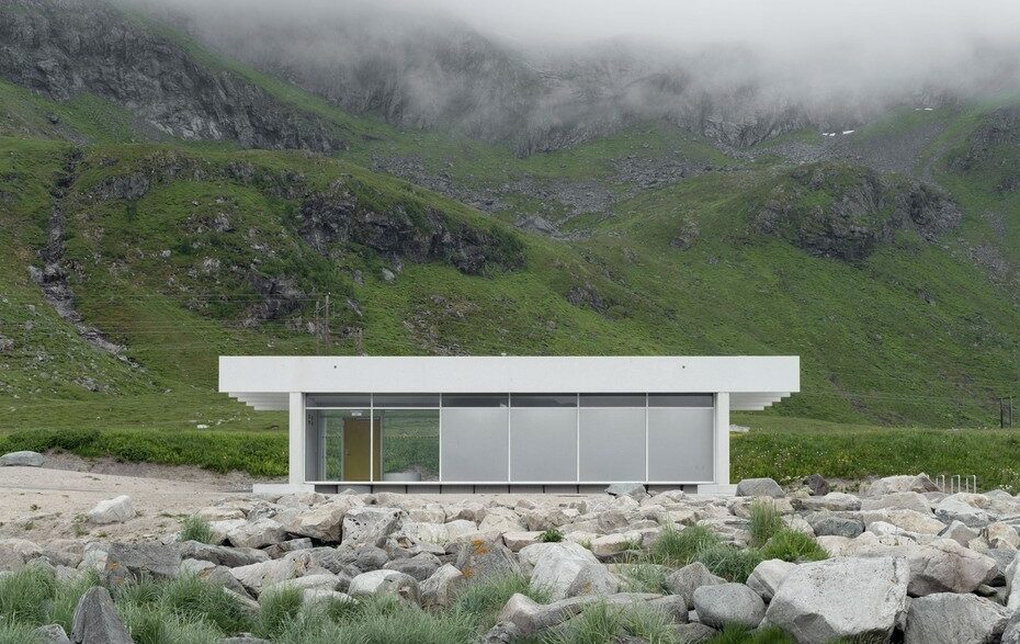Этот проект был реализован студиями Jørgen Tandberg Architecture и Vatn Architecture на Лофотенских островах. Возведенное из сборных бетонных элементов здание Brunstranda Service Building представляет собой простой прямоугольный объем. Крыша сооружения выходит за пределы внешних стен, обеспечивая крытые площадки, где туристы могут укрыться от непогоды. Вдоль той части фасада, которая обращена к морю, установлена длинная скамья.