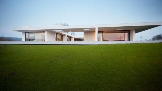 использован просторный земельный участок в холмистой местности. Белое одноэтажное