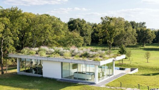 Это сооружение с прозрачными стенами построили в американском городе Палмере (штат Техас). Главный дом усадьбы расположен на холме выше, а возведенное на ее территории прозрачное здание с бетонной крышей и бассейном предназначено для непродолжительного отдыха. На кровле высажены различные местные растения (шалфей, юкка и т.п.).