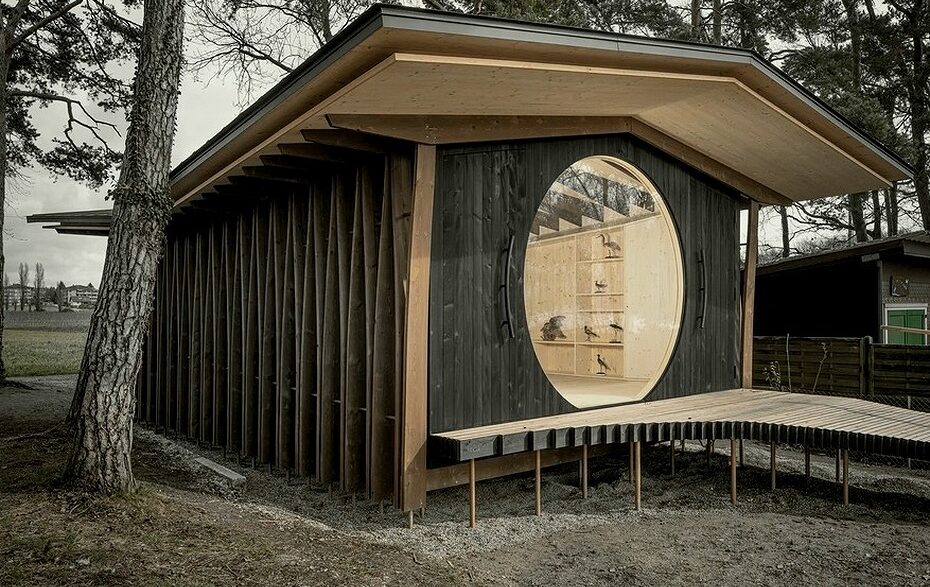 Площадь оригинального сооружения, названного «Птичий остров», составляет 49 кв. м. Заказал данный проект орнитологический клуб Лозанны. Возведенное на берегу озера здание отличается очень простой планировкой: тут имеется центральное помещение, кухня и туалеты. Через необычное круглое окно посетители могут наблюдать за птицами, находящимися в их естественной среде обитания.