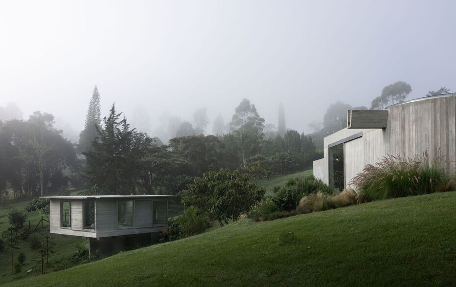 Оригинальную жилую резиденцию создали специалисты студии LCLA Office из Норвегии и архитектор Клара Аранго. Строение расположено среди гор и лесов в Ретиро на высоте 2,1 тыс. метров над уровнем моря. Данный объект недвижмости состоит из двух отдельных сооружений площадью 60 и 75 кв.м., которые связывают дорожки и разбитые здесь новые сады. Постройки наглядно демонстрируют разные подходы авторов проекта к работе со склоном. Так, одно из зданий выглядит парящим, поскольку возвышается на четыре метра над землей на специальной колонне, а второе больше напоминает пещеру, т.к. имеет длинную форму и частично заглублено.
