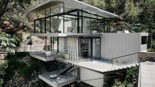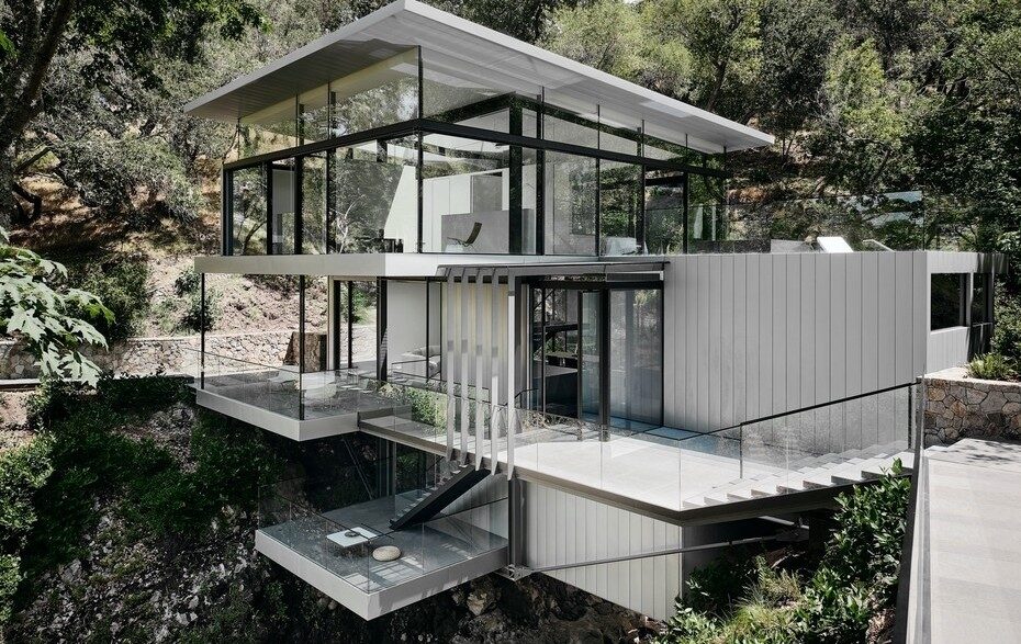 Этот проект под названием Suspension House реализовала студия Fougeron Architecture. Старый дом, возведенный между двумя холмами над водой, превратился в современную комфортабельную резиденцию. Архитекторы использовали подвесную конструкцию, чтобы свести к минимуму негативное воздействие сооружения на природную среду и ручей. Этажность здания с наклонной крышей в результате произведенных работ удалось увеличить до трех уровней. Таким образом, общая площадь сооружения достигла 232 кв. м.