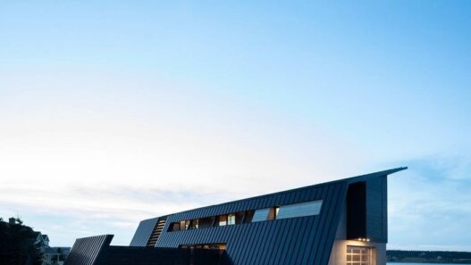 В резиденции с нестандартным экстерьером черного цвета два уровня. Также тут имеется большая терраса на первом этаже. Из окон здания открываются прекрасные виды на морские пейзажи.
