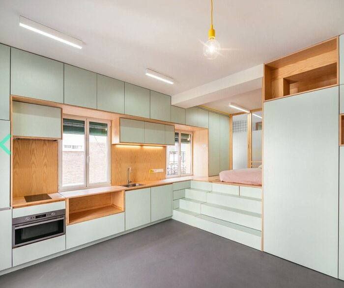 Проект получил название Yojigen Poketto. Такая квартира площадью примерно 30 кв. м. имеет два уровня: основное помещение расположено внизу, где предусмотрена кухня, гостиная и столовая. Между тем на подиуме, который приподнят на 90 см, находятся спальня и ванная. Нестандартный рельеф помещения позволил создать дополнительные функции и много «секретных» мест.