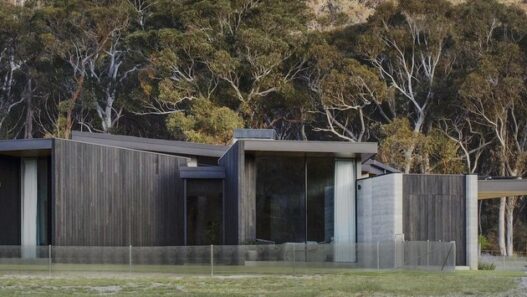 Основными строительными материалами при реализации этого проекта стали бетон, утрамбованная земля, древесина и стекло. Интерьер здания выполнили в современном стиле с преобладанием темного дерева, эффектно перекликающегося с внешними стенами. Щедрое панорамное остекление позволяет жильцам не терять связь с уникальным по красоте ландшафтом.