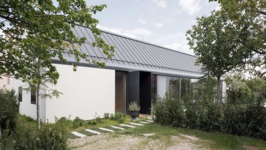 Жилой дом для молодой семьи, получившее название House V, возвели недалеко от Братиславы. Площадь такого сооружения с остроконечной металлической крышей и большими панорамными окнами составляет 185 кв.м. Фасад объекта выкрашен в белый цвет.
