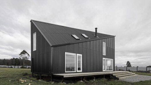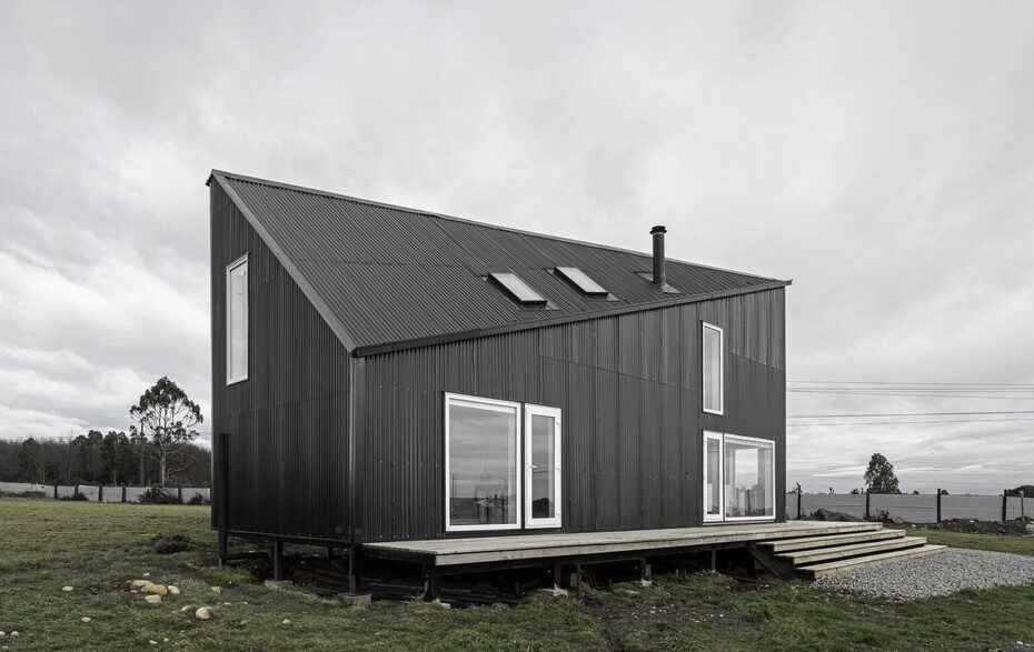 Проект, получивший название Ridge House, был реализован в чилийской провинции Льянкиуэ. По своему внешнему виду этот дом площадью 120 кв. м. напоминает традиционный местный амбар. Здание установили на невысоких сваях, которые защищают сооружение от коррозии. Подобное решение архитекторов также позволило свести к минимуму негативное воздействие появившейся конструкции на окружающую среду. Дом получил специальную деревянную палубу, где его обитатели могут отдыхать на свежем воздухе. Отдельный объем, соединенный с основным корпусом прозрачным переходом, предназначен для гаража.