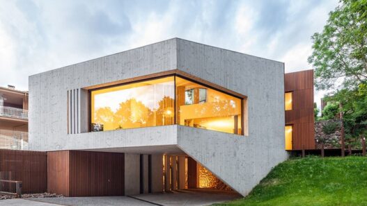 Жилое здание с большими окнами получило весьма сложную форму, поскольку земельный участок расположен в местности с неровным рельефом. Вход находится в нижней части сооружения, а основная его часть с террасой для отдыха расположена наверху. Чтобы закрепить дом на своем основании и не допустить его сползания вниз по склону, архитекторы предусмотрели специальную подпорную стену.