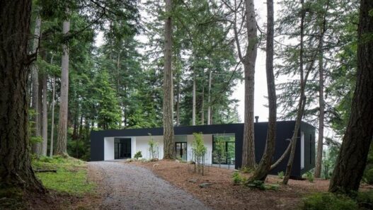 Фасады особняка, возведенного в лесу, отделаны металлическими панелями черного цвета и белой штукатуркой. При оформлении интерьера, кроме прочих материалов, здесь также использовался мрамор и бетон.