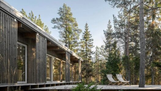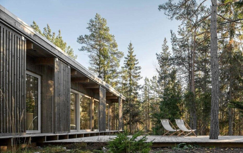 Площадь одноэтажного здания для летнего отдыха, построенного в Швеции, составляет 42 кв. м. Оригинальный объект состоит из двух изолированных частей, объединенных общей крышей и террасой. Так, в корпусе площадью 32 кв. м находится гостиная, кухня, столовая и ванная. В полупрозрачном кубе (10 кв.м) расположена спальня. Между этими сооружениями образовался небольшой внутренний двор с уютной зоной отдыха.